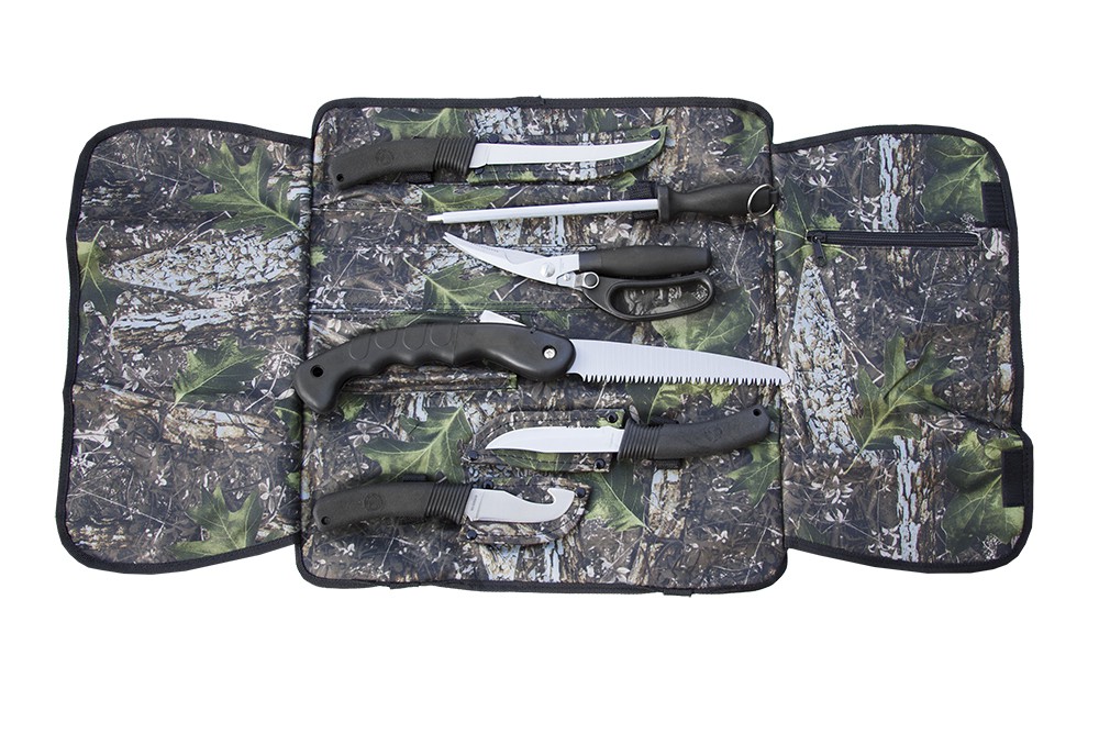 What hunter wouldn't love a soft game roll knife kit with everything they would need to make short work of dressing that trophy buck? This 6-piece hunting kit includes an 11.5" steel sharpening rod, a 9.5" folding bone or tree saw, a pair of 9.5" game shears, an 8.5" gut-hook skinning knife, an 11.375” fillet knife, a 9.5" drop point knife, and latex rubber gloves. Each tool in our hunter's kit comes with a 440 stainless steel blade and has molded non-slip black rubber handles. All pieces fit in a zipper-pocket camo nylon roll-up case with Velcro straps. We make hunting easy with our quality knife collection! Shop all of our great knife products today!