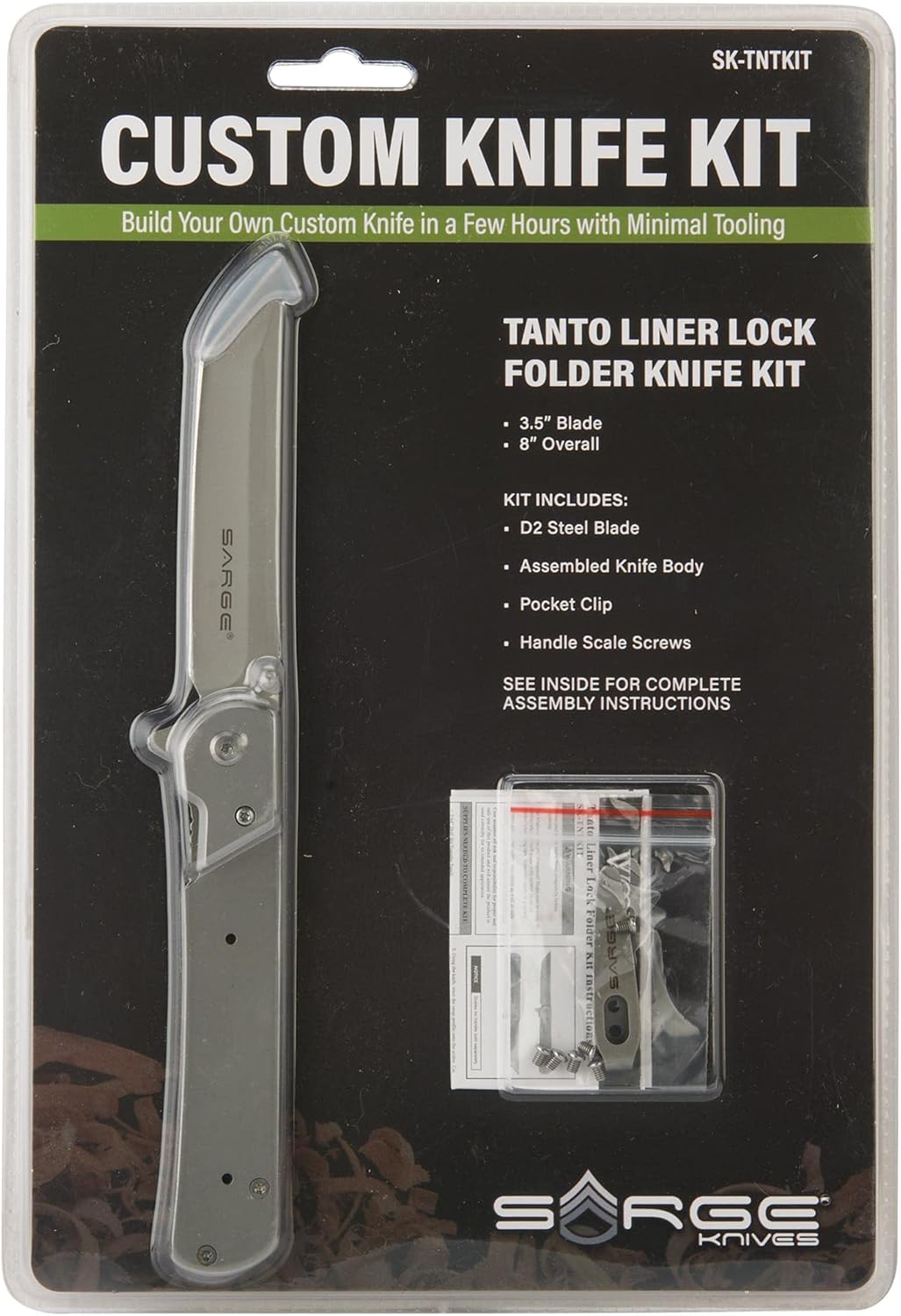 Use this Sarge Knife Kit to create a truly one-of-a-kind pocketknife. The Sarge Knives Tanto Liner Lock Folder Knife Kit will easily become your favorite everyday carry knife. The sleek and refined design of this knife features a 3-1/2" D2 Stainless Steel Tanto Style blade, thumb stud and finger paddle for ease of blade operation. You can take this knife everywhere with you, since it fits comfortably in or conveniently attached to your pocket with the included pocket clip. You can make a high-quality pocketknife like an expert without the metalworking tools. Shape, mount, and finish your custom handles for a truly one-of-a-kind pocket knife. Handle material sold separately.